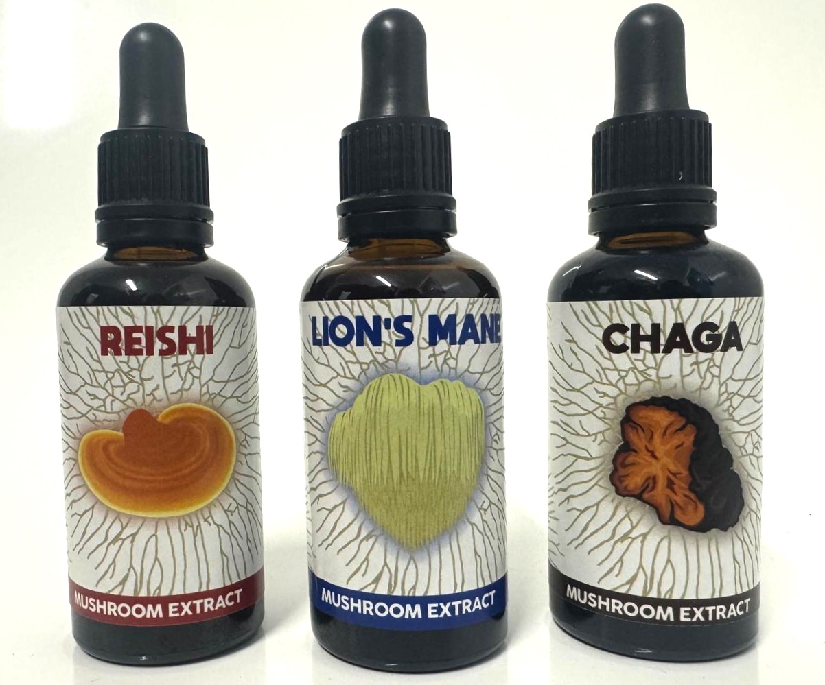 Our 3 mushroom duel extract tinctures are extracted, from start to finish, on-site here at Isle of Wight Mushrooms into supplements that you can take each day. Lions mane and reishi are cultivated and grown here at the farm and the chaga was foraged by us in the Scottish Highlands. Add one to four droppers of each one together each day to whatever food or drink you're having or you can simply take them off the spoon. This will provide you with the full spectrum of benefits that each has to offer.